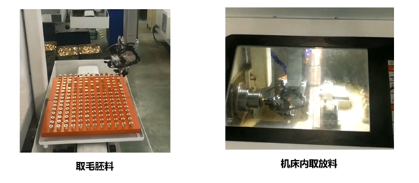 毛坯料盘上料——机械手在料盘取原料——原料二次定位——机械手左(右)待机——进左(右)机床取成品——机械手放原料——机械手在料盘放成品——料盘下料(成品放满)依次循环。