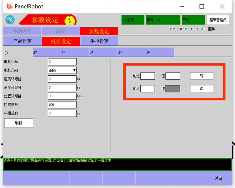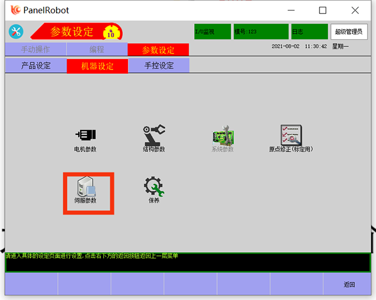 1、先进行权限登录,然后把手控器的状态切换为停止状态,然后找到参数设定中的机器设定中的伺服参数;